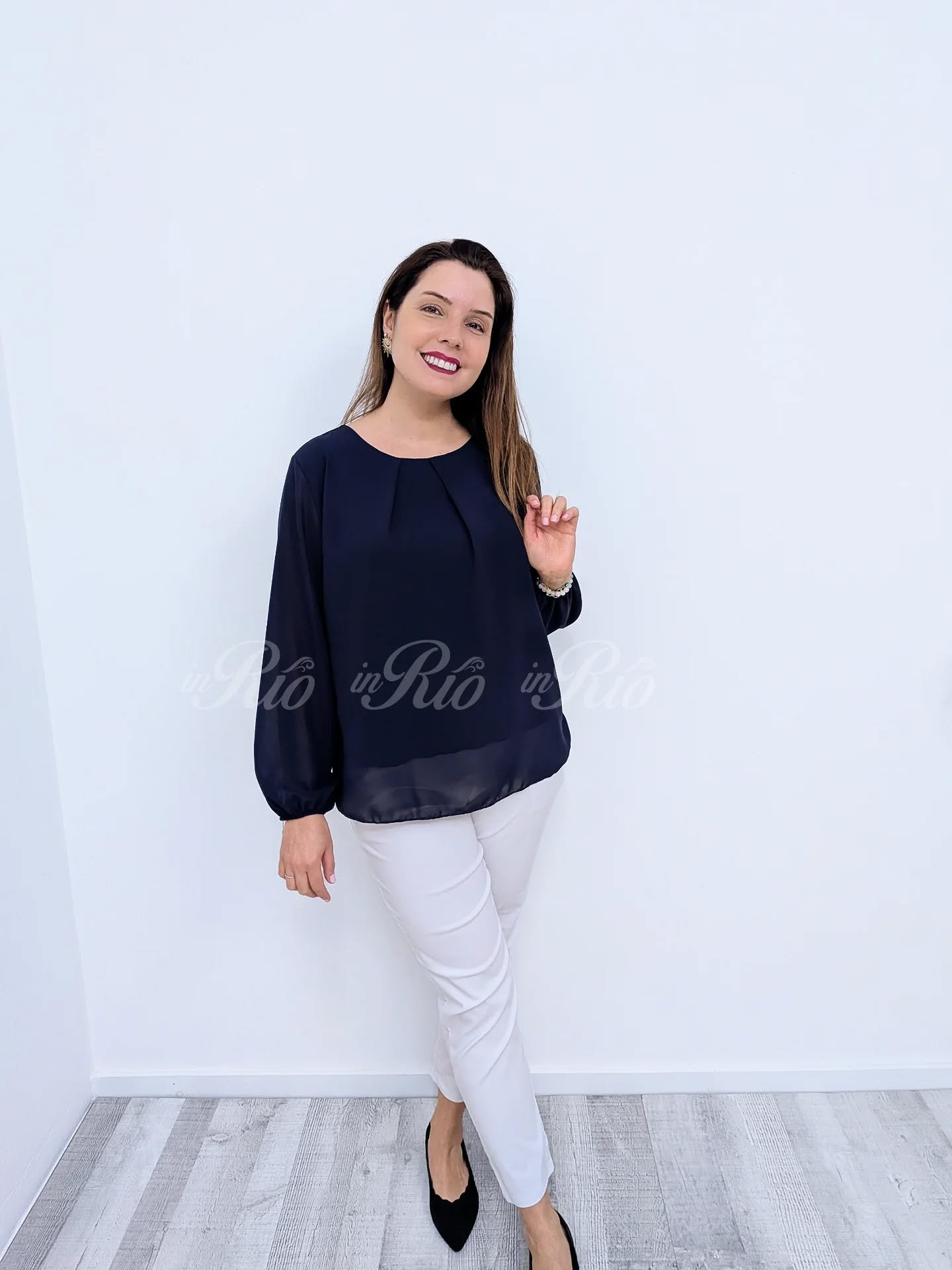 Usa esta blusa fluída por dentro ou por fora, porque o efeito é sempre o mesmo: bonito!