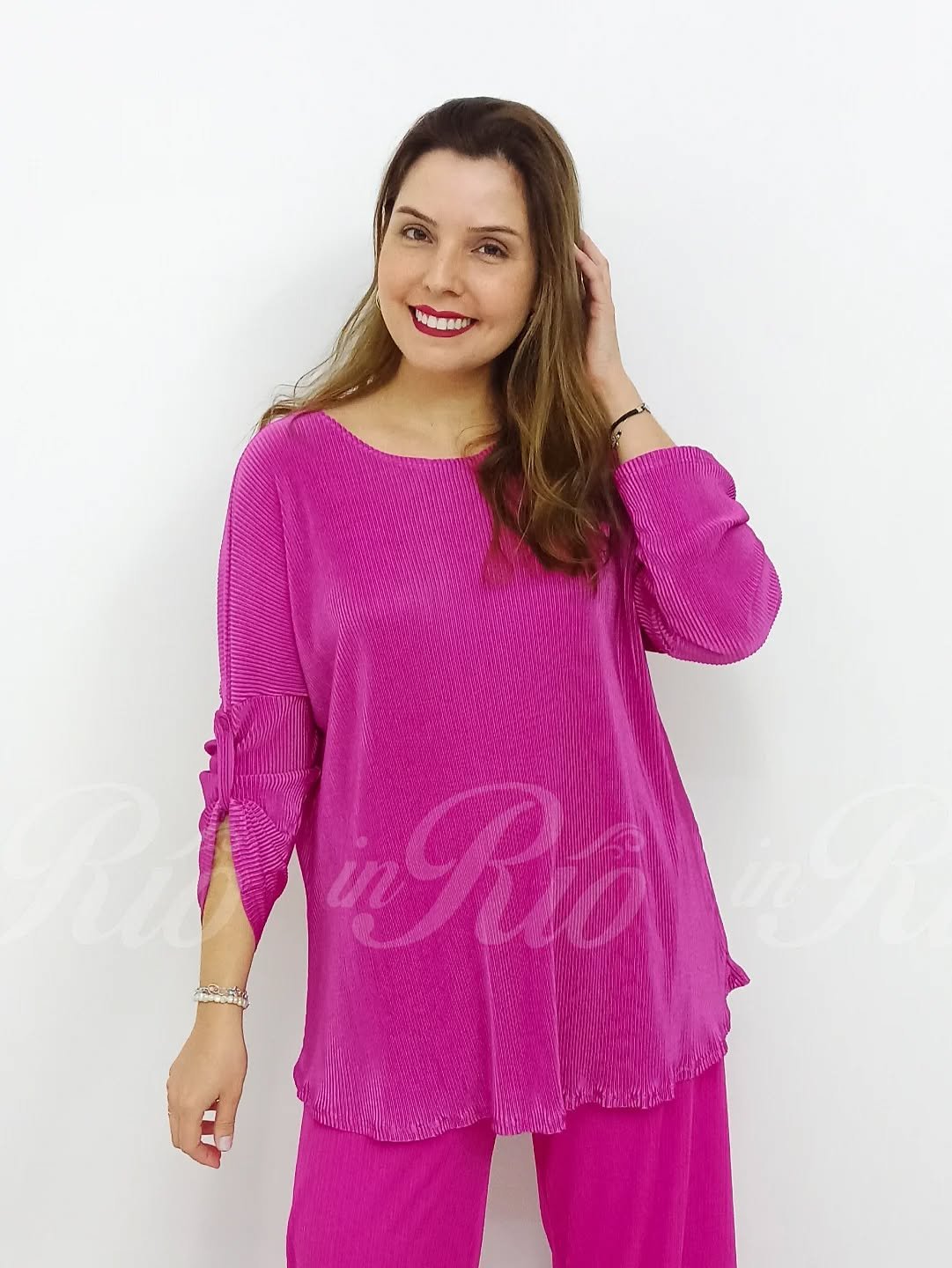 Blusa plus size em tecido acetinado plissado na cor rosa forte com mangas 5/8 e presilhas para fazer mangas 3/4 .