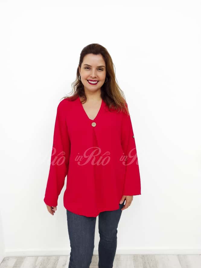 Simplicidade e elegância estão presentes nesta blusa fluída com botão, prega À frente e presilhas para fazer mangas 3/4.