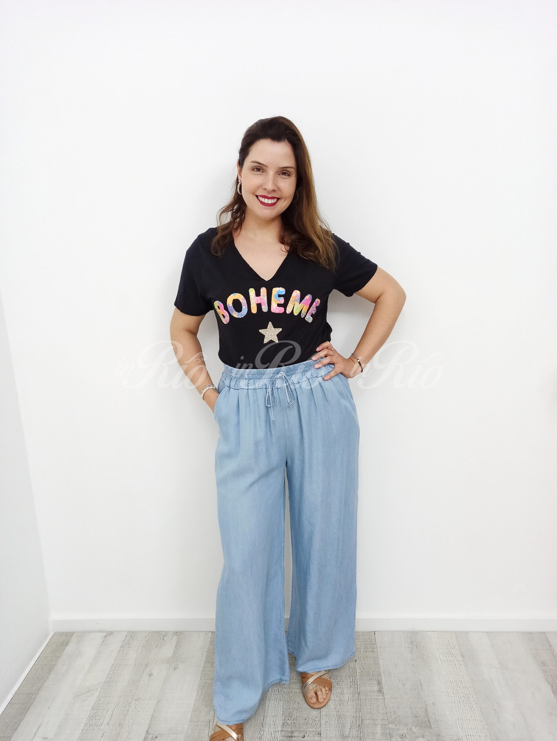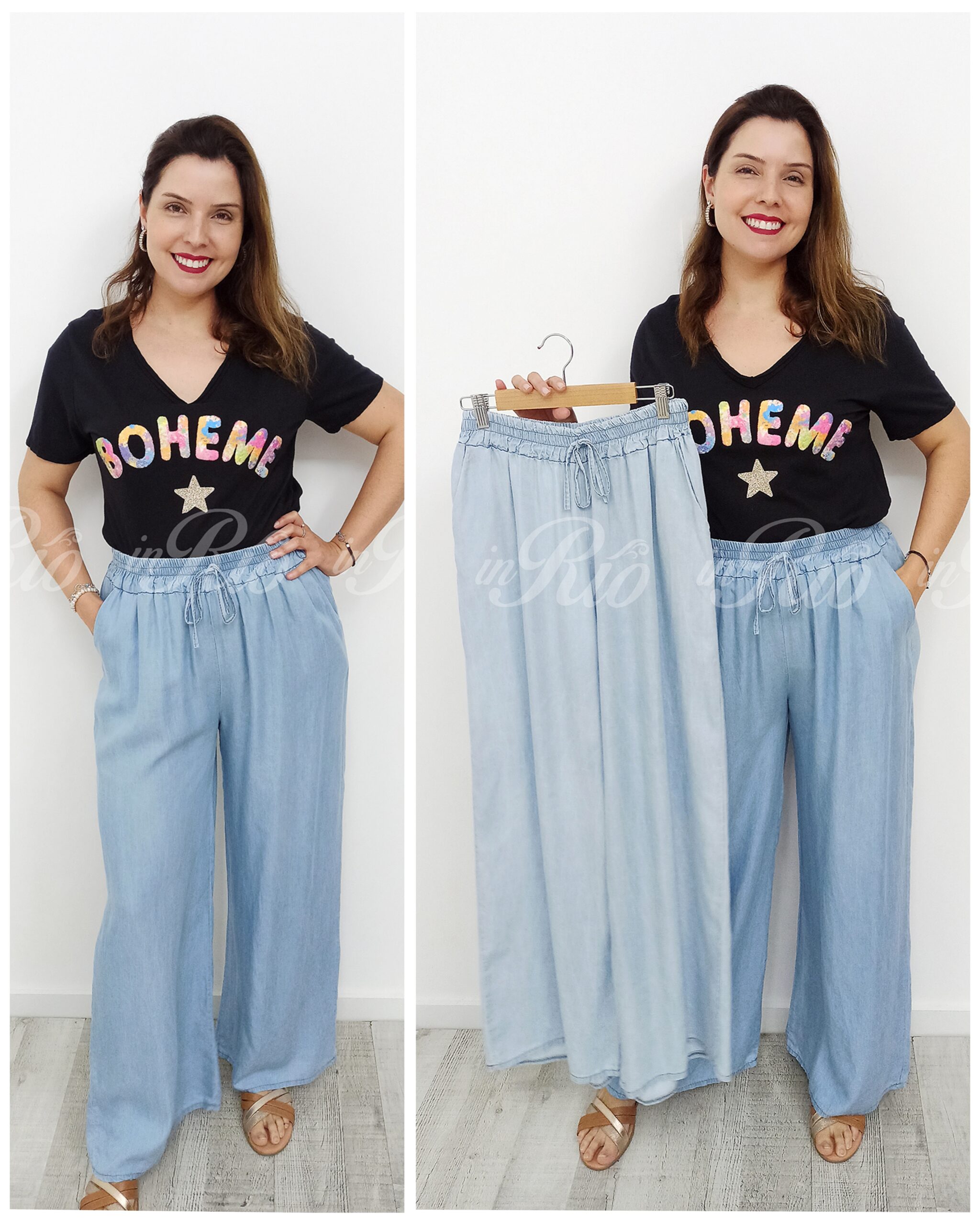 Elegante calça pantalona plus size em tecido tipo ganga fina.