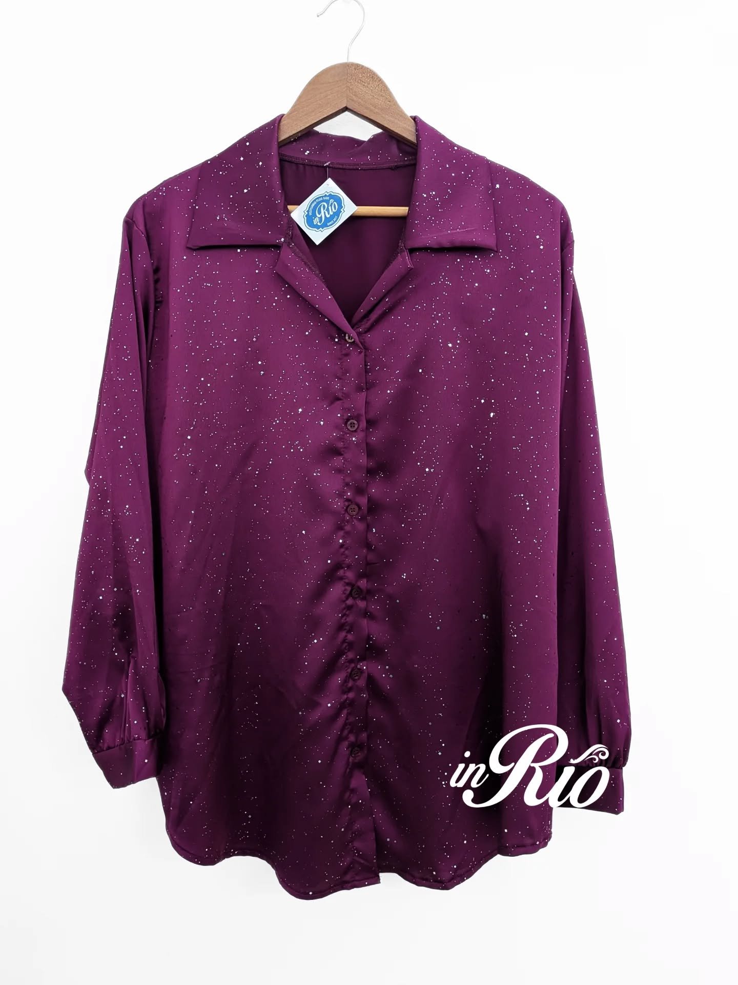 É incrível esta camisa em tecido acetinado com brilhantes prateados!