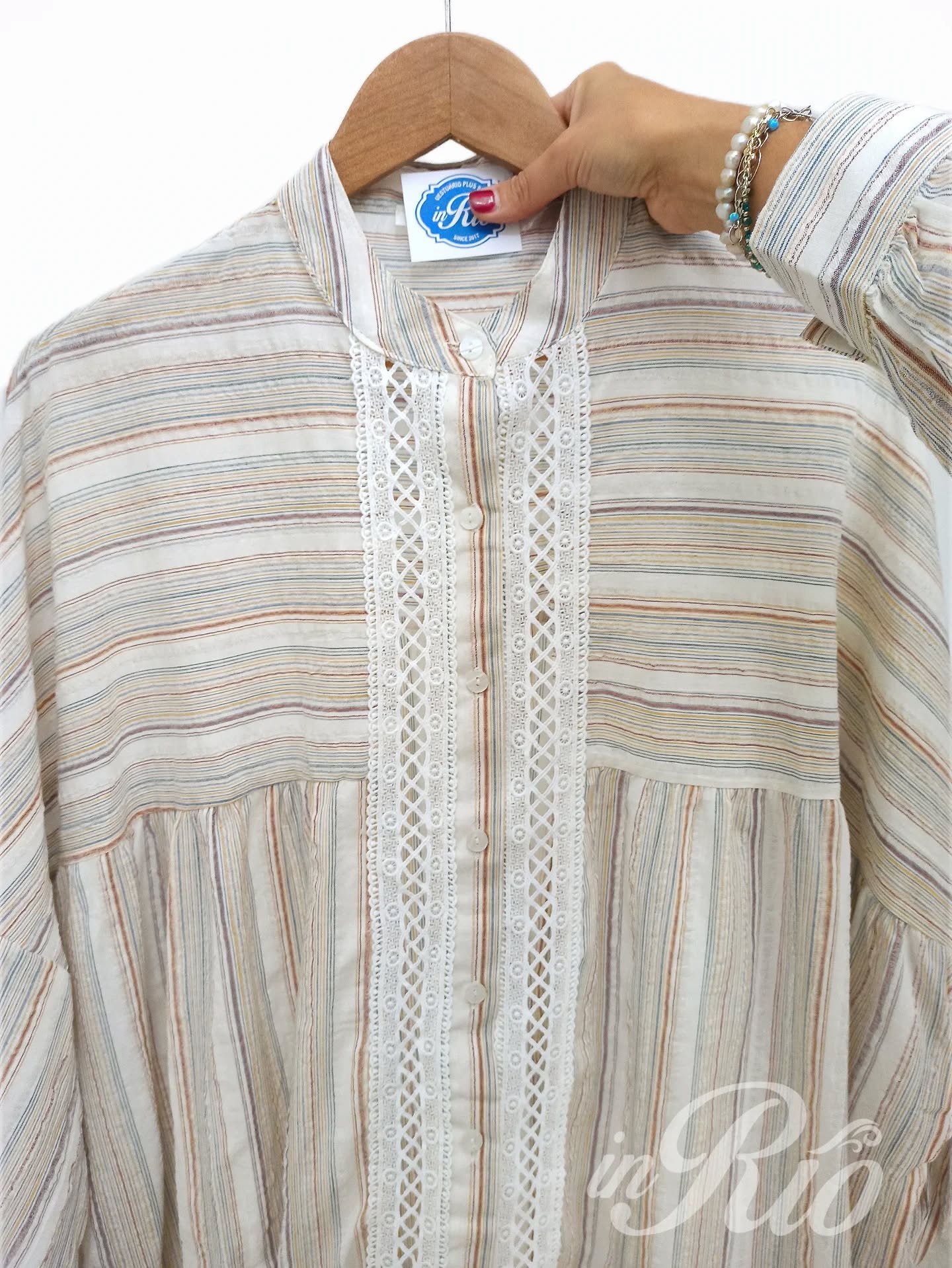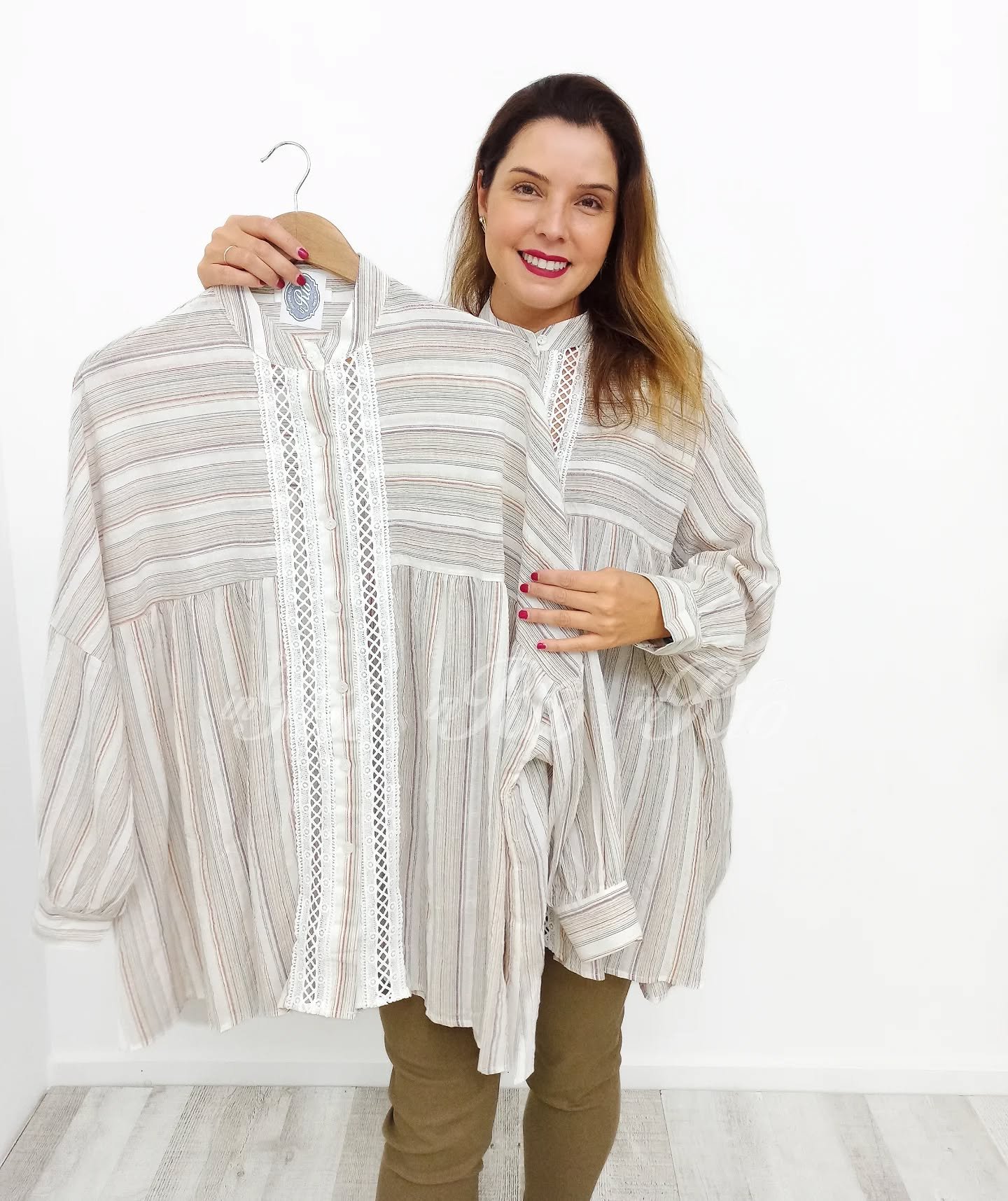Esta camisa oversized em tons terra é para as nossas mulheres irreverentes, que entendem a beleza da renda guipir, a modernidade da gola mao e o conforto de uma peça em 100% algodão!