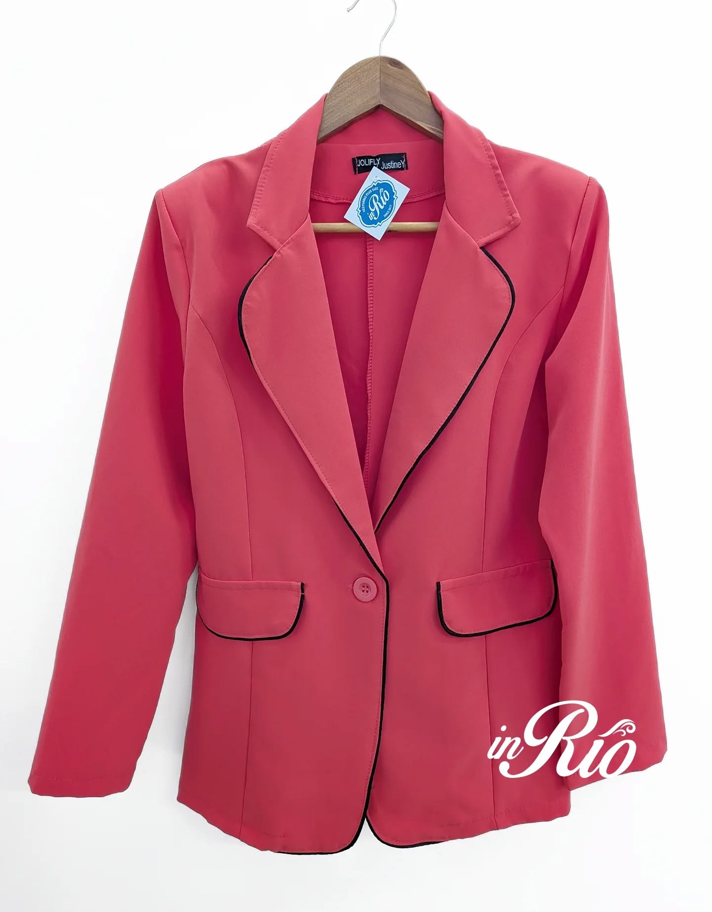 Blazer cintado na cor coral com detalhes pretos, bolsos falsos e sem forro.