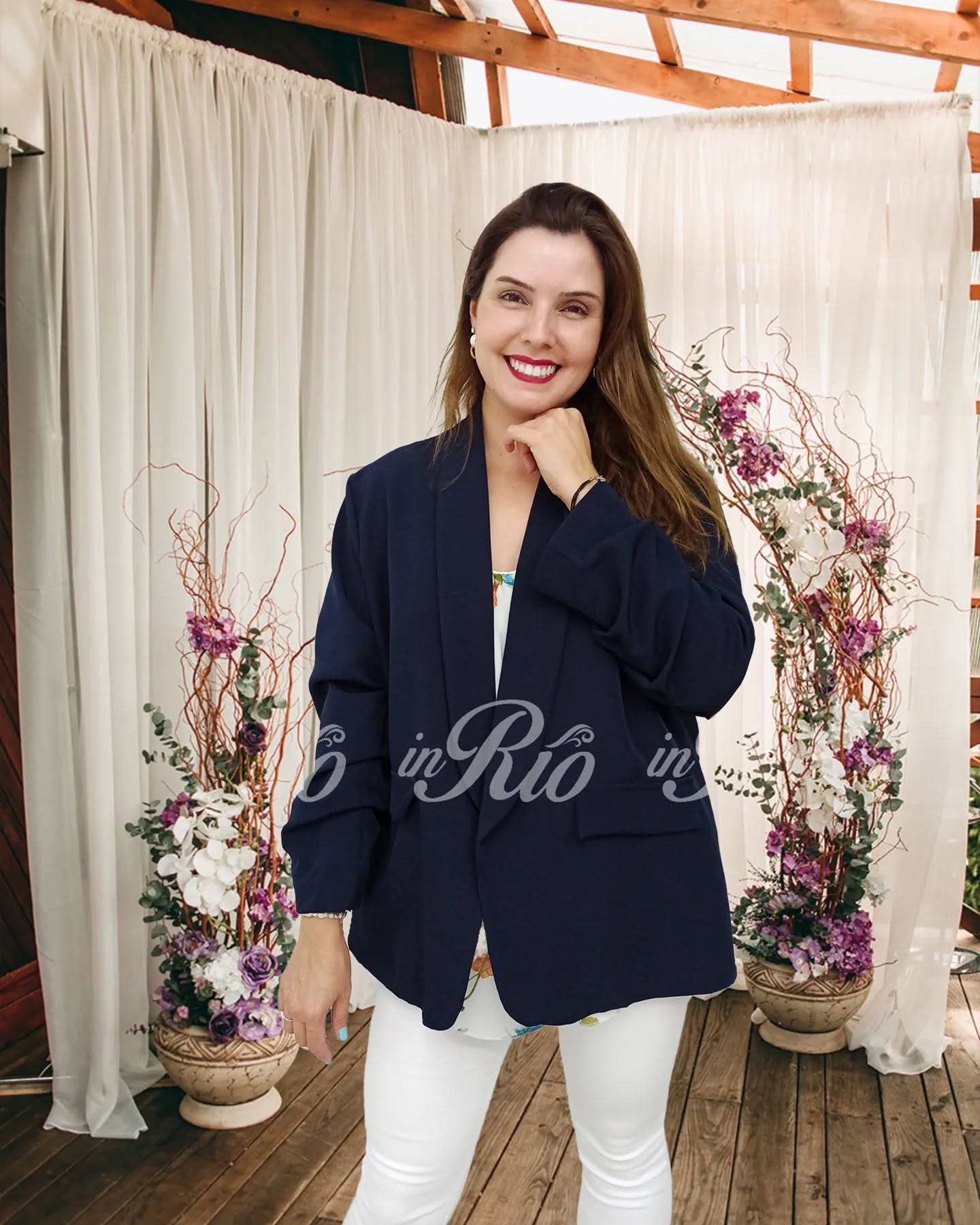 Blazer plus size azul escuro com mangas drapeadas, forro e bolsos falsos.