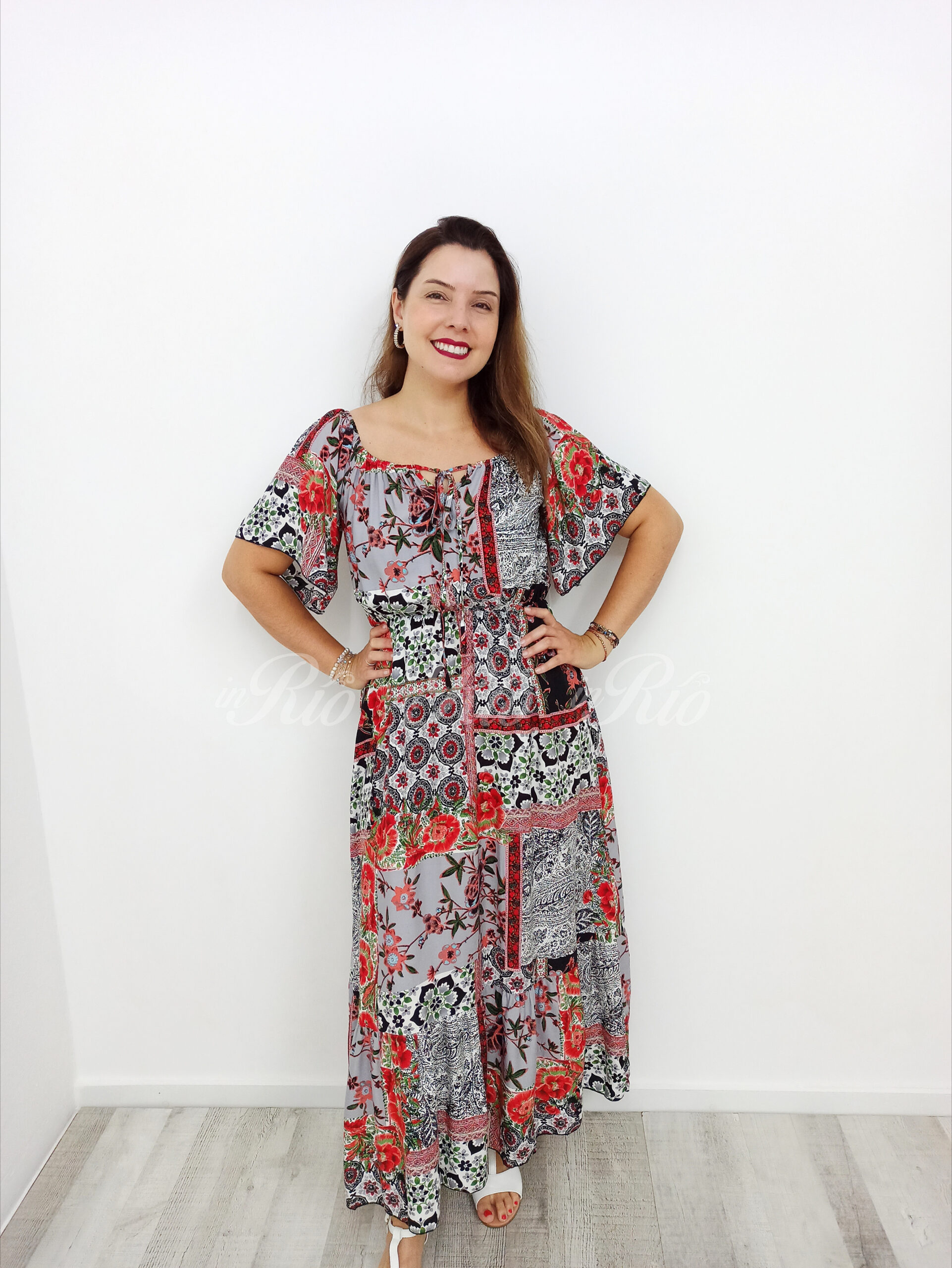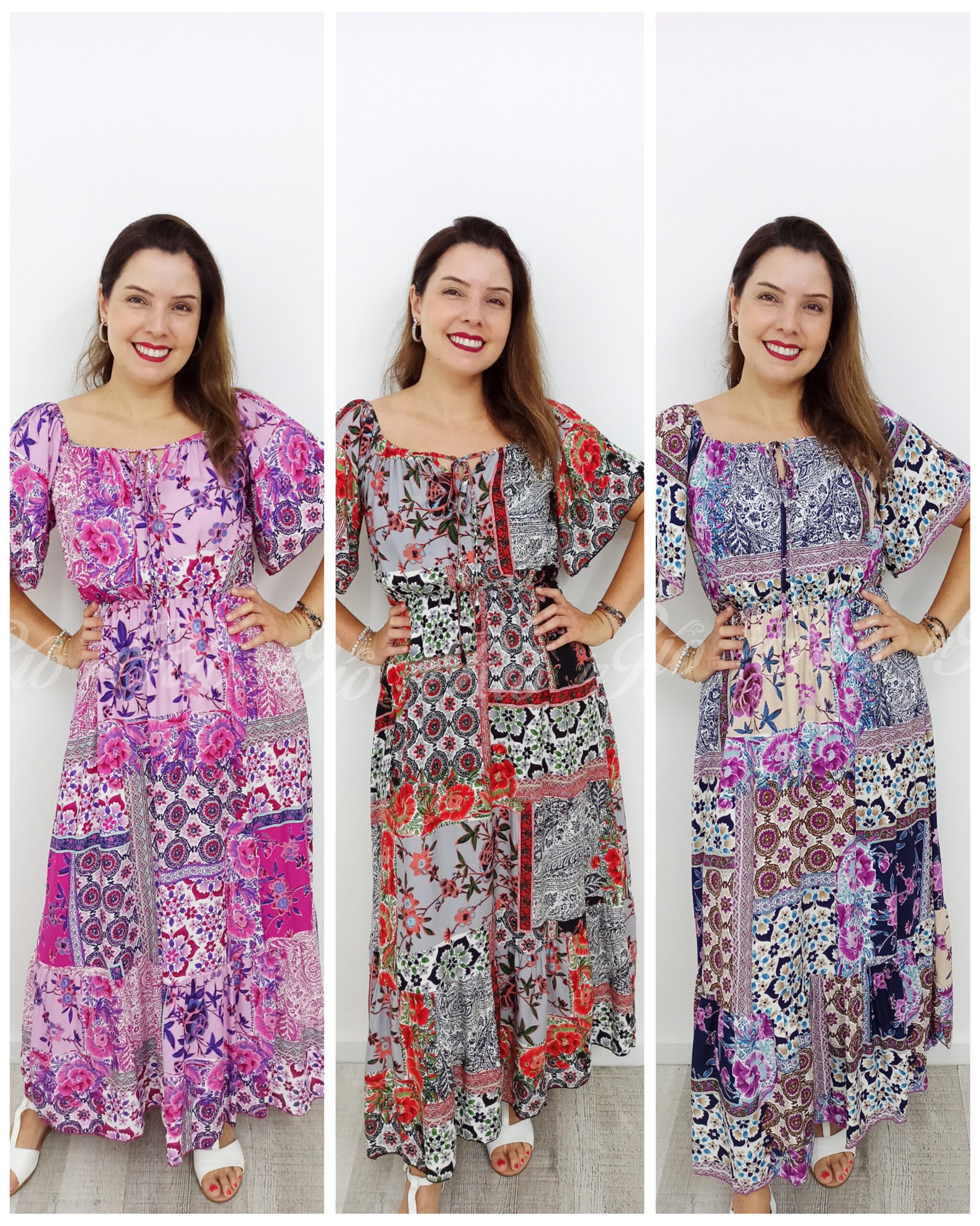 É maravilhoso o nosso vestido longo com padrão em patchwork!