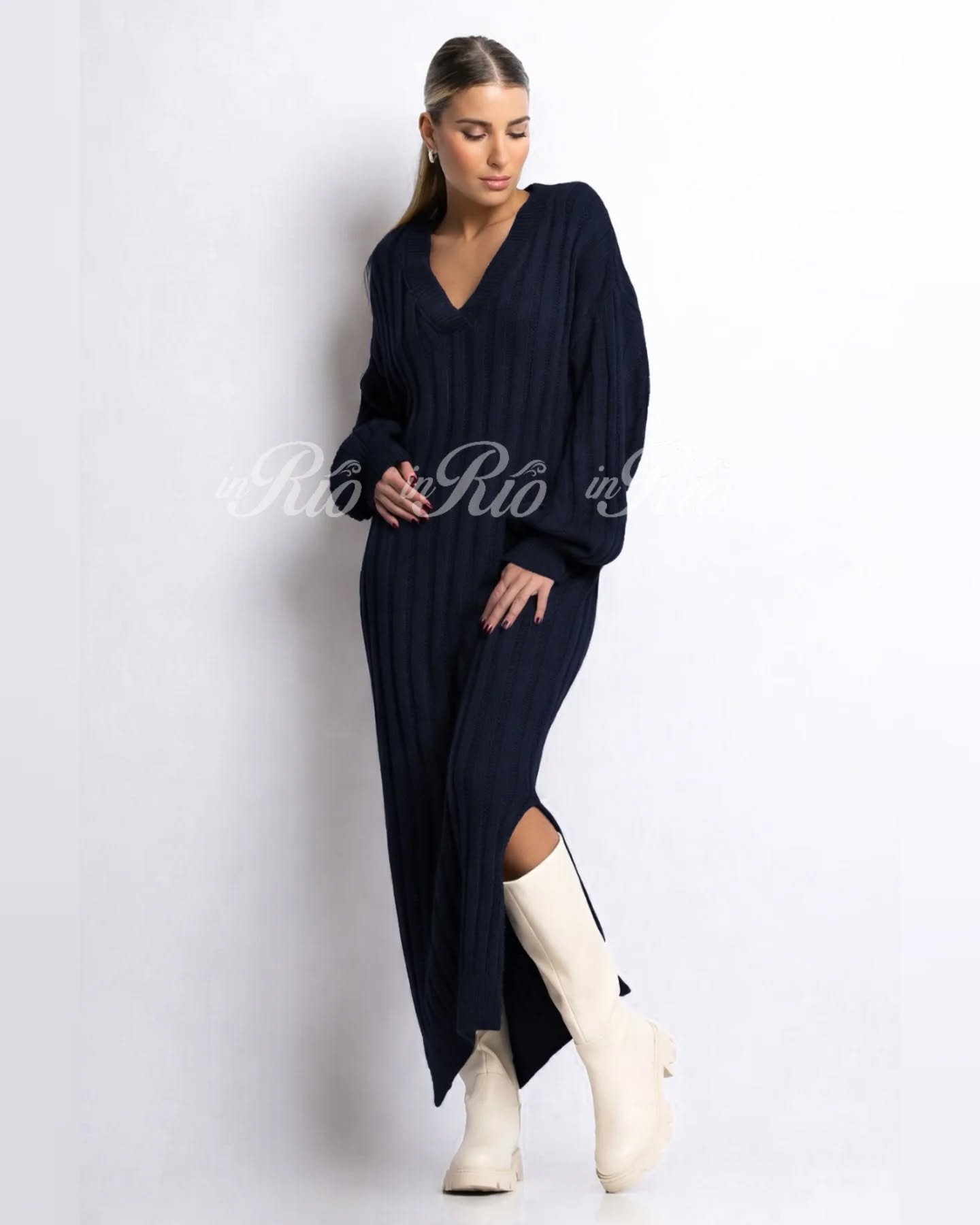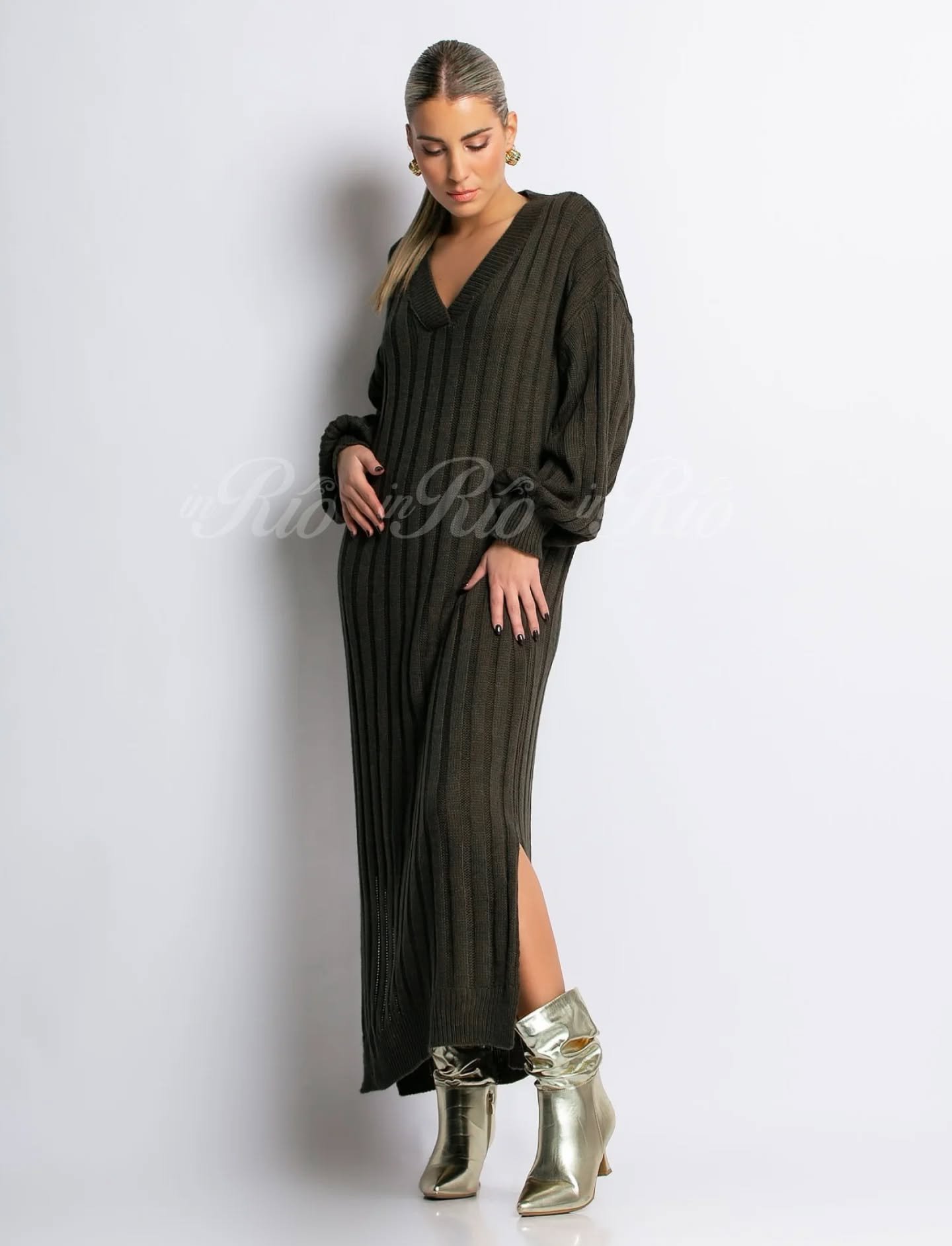 Vestido longo oversized em malha com decote em V.